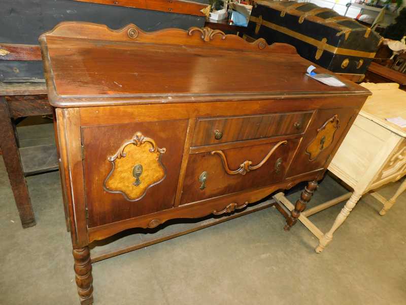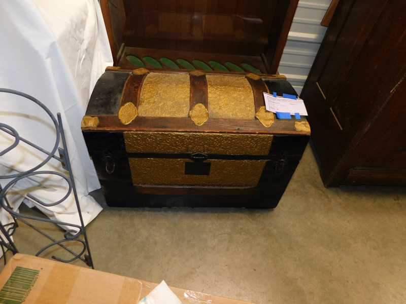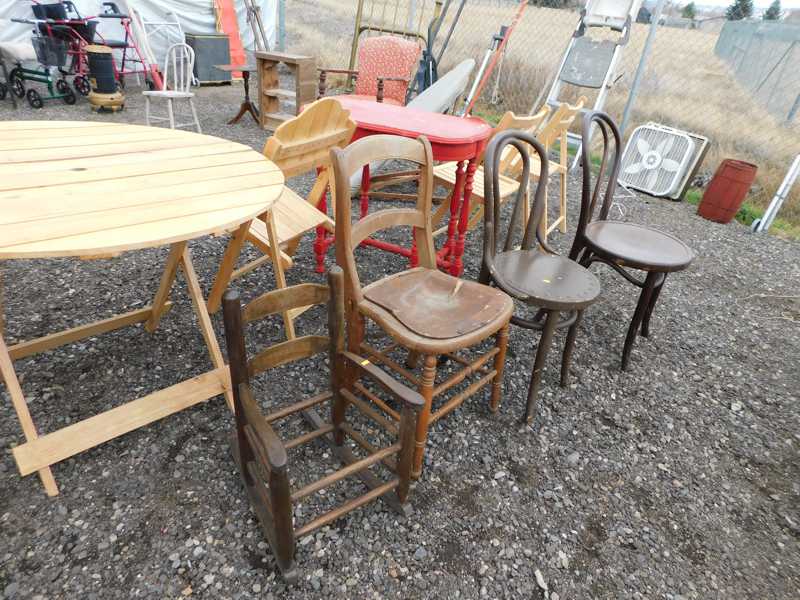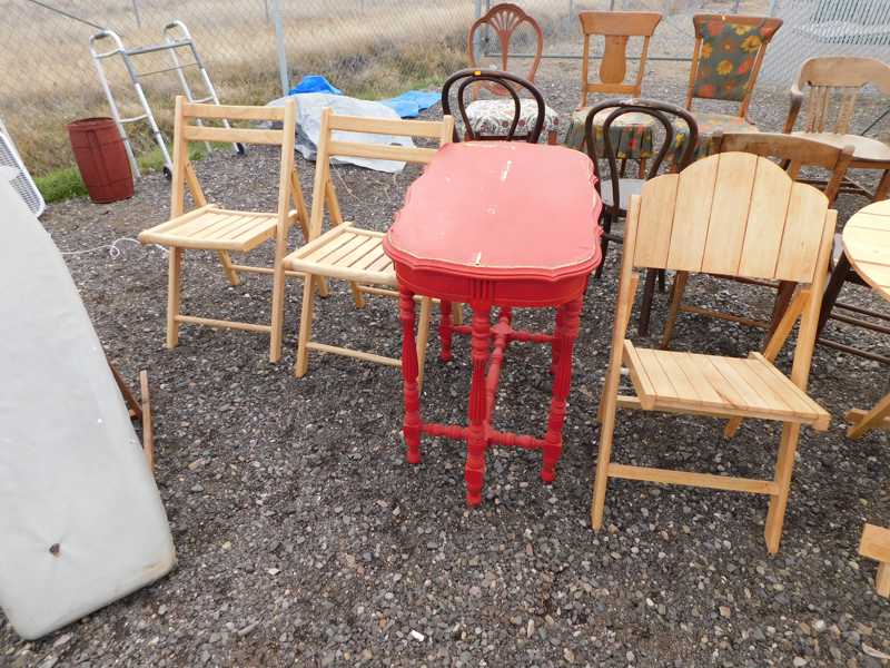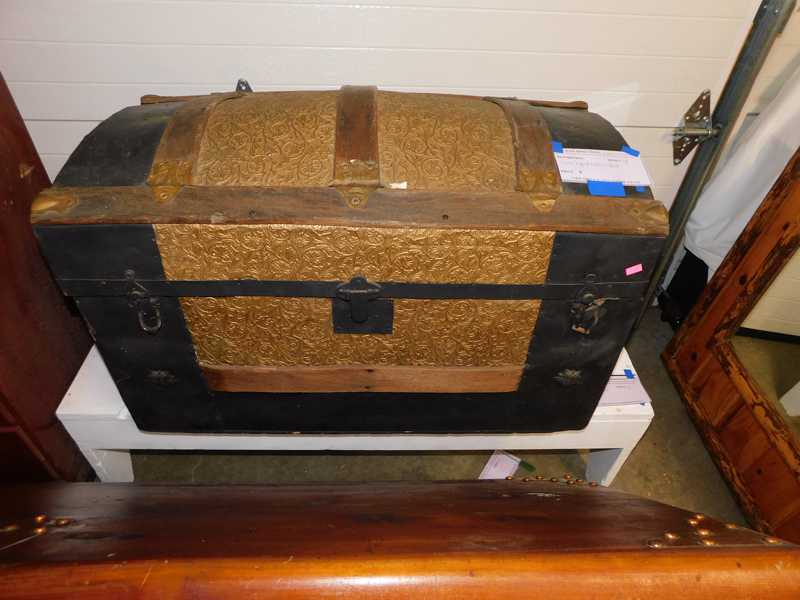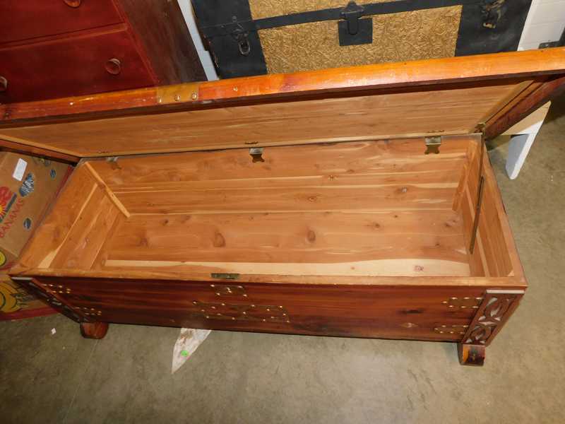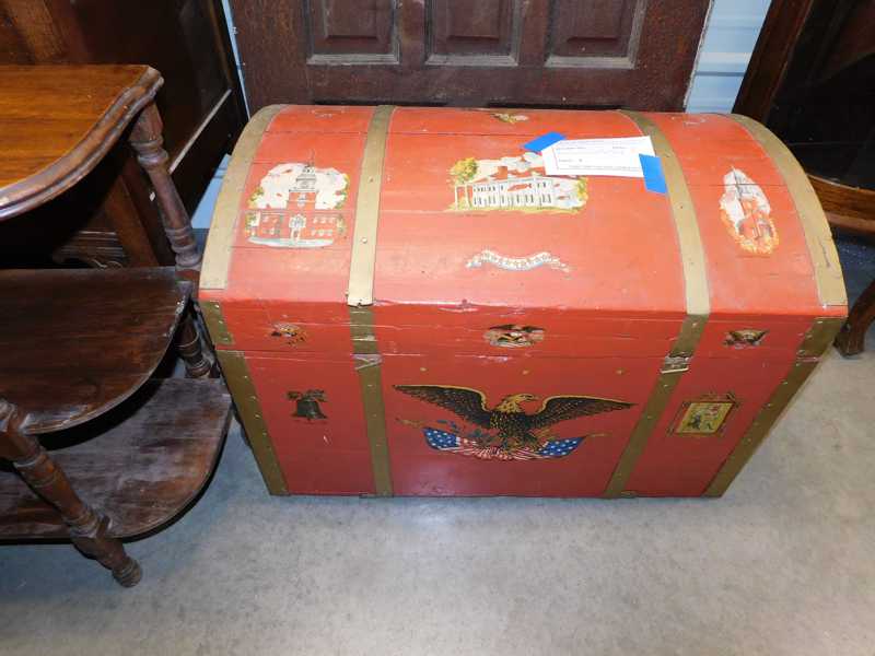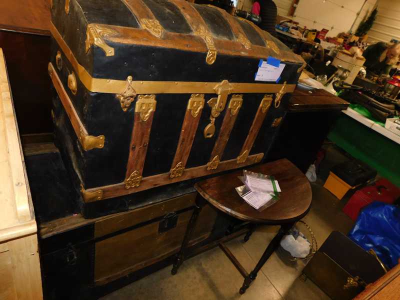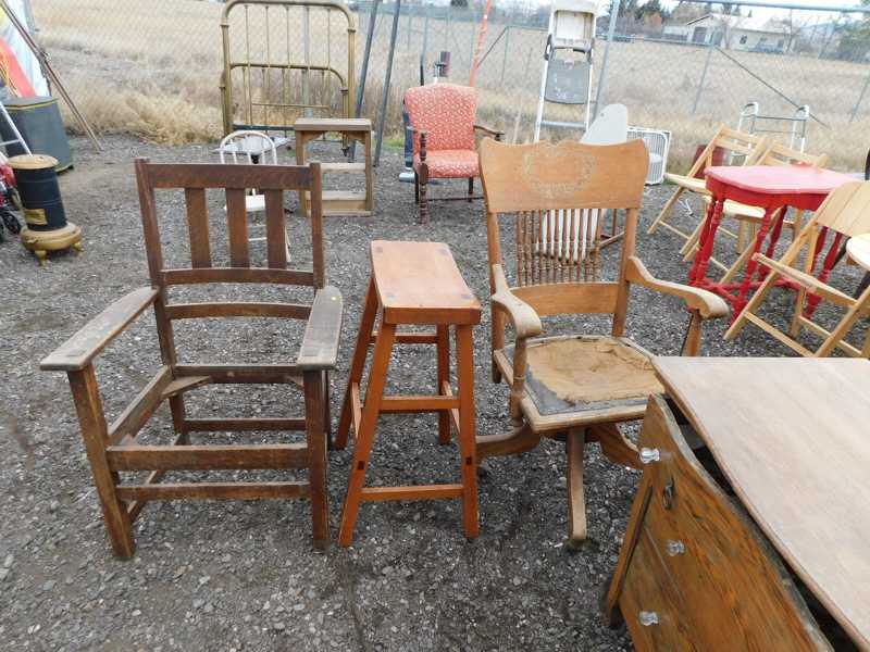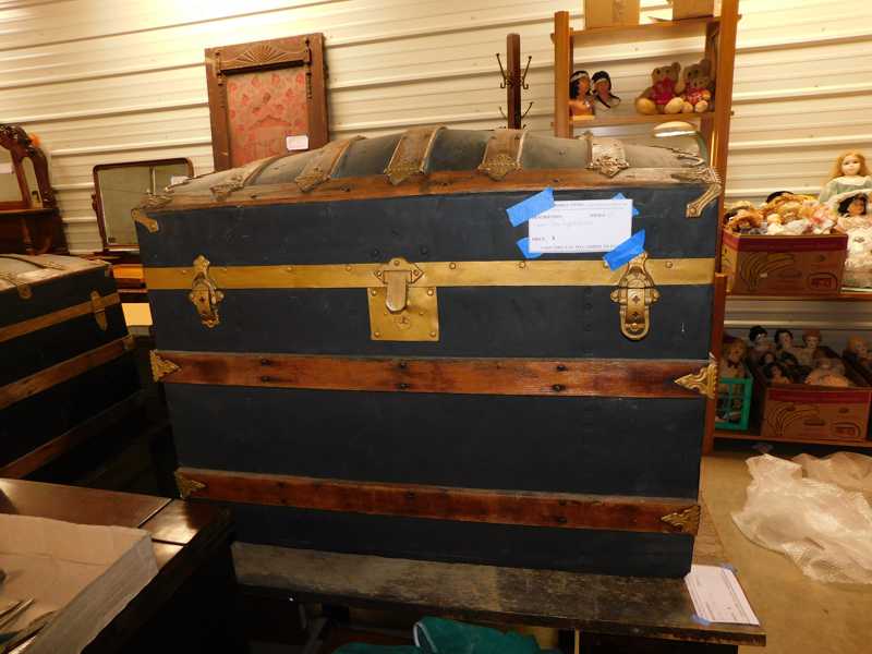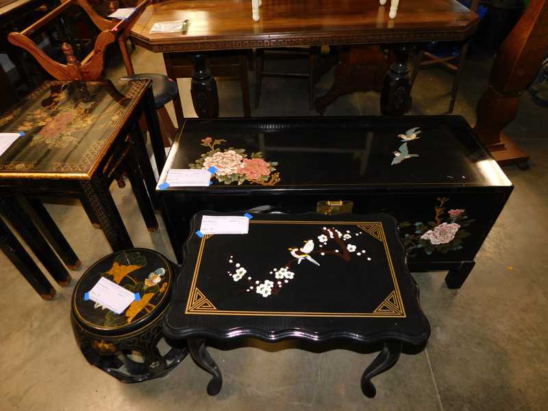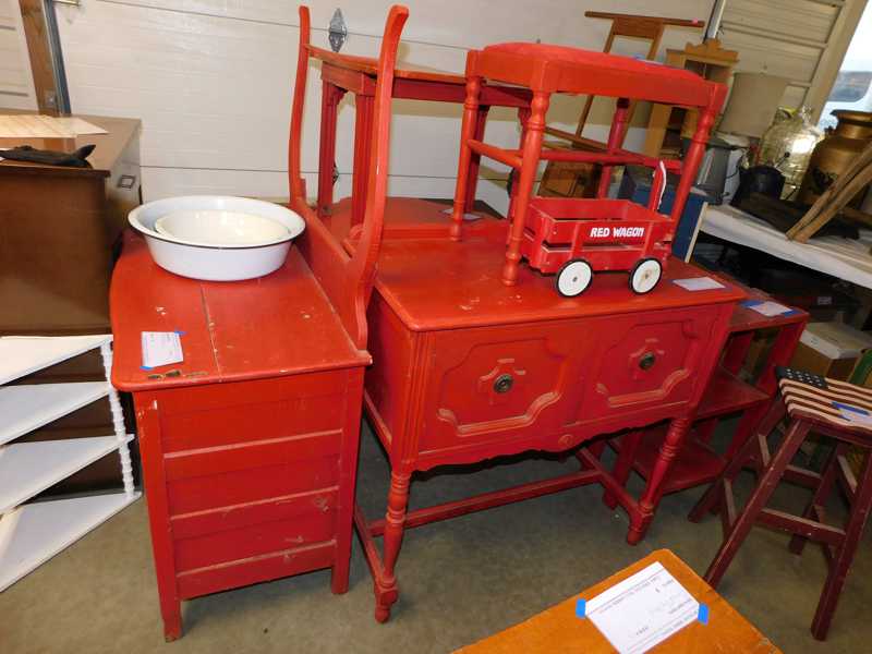 Furniture includes-older curved glass china cabinet, antique buffets, dressers, occasional tables, chairs, 10 antique trunks, gun cabinet, brass bed, tiffany style stained glass lamp, Dragon Fly lamp, antique door with etched glass, painted and furniture projects. Lodge bed and mirror. Cedar Chest, Plant stand, Hall tables. Asian lacquered tables and chests.
