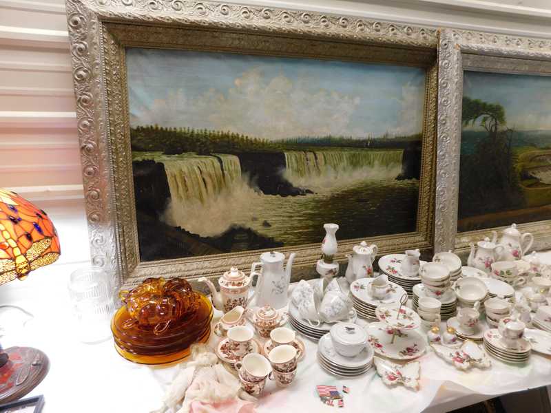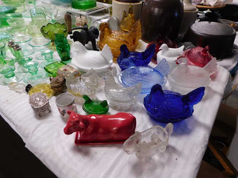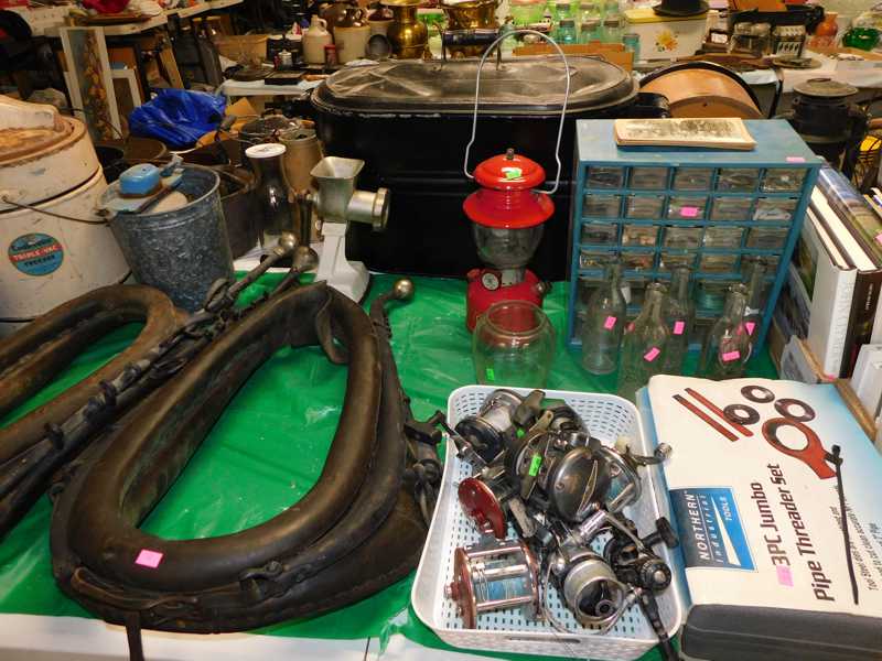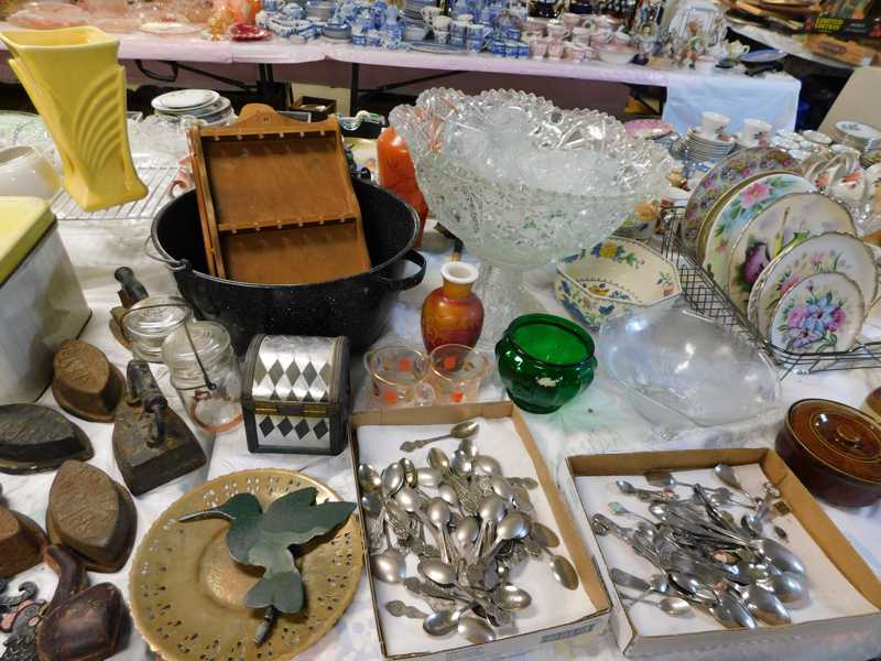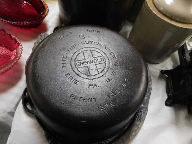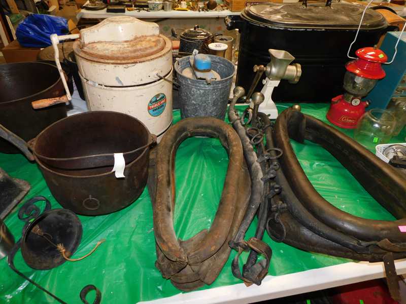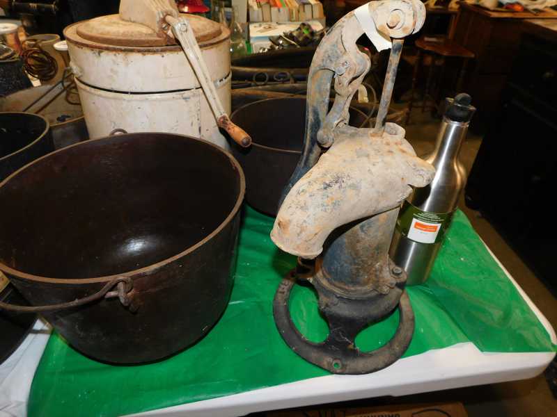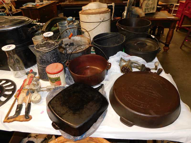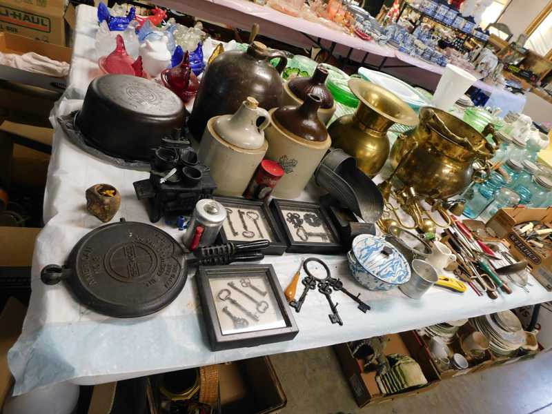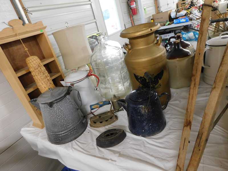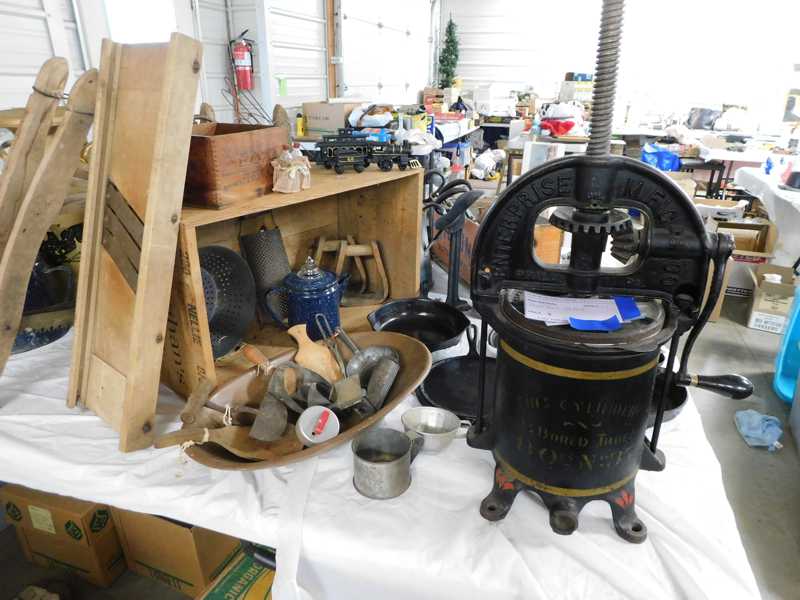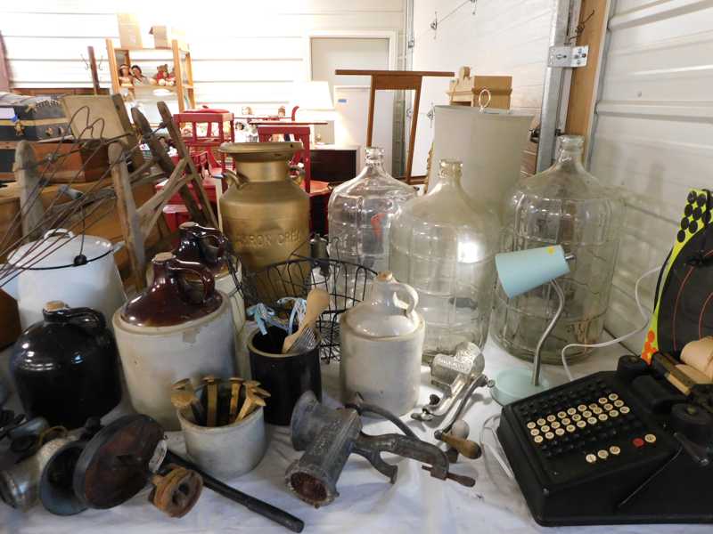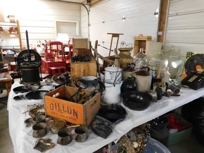 Depression glass, art glass, blue willow, lots of glassware and porcelain that has been packed since 1967. Primitives, advertising wood crates, Pyrex, Corning ware, McCoy, lots of cast iron Wagner, Griswold, #15 skillet, hand pump, antique fruit press, cream cans, oil lamps, sad irons, stoneware jugs and crocks, enamelware, Tools, Craftsman miter saw. Nice jewelry that we are just unpacking, decorator items, old skis, toboggan, dog kennels, old glass water bottles, books, art including some large antique oil paintings, Russell and signed Monte Dolack, Doll collection, Lots of Christmas decor.