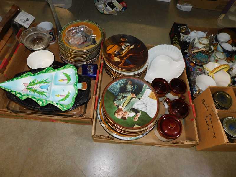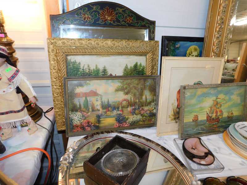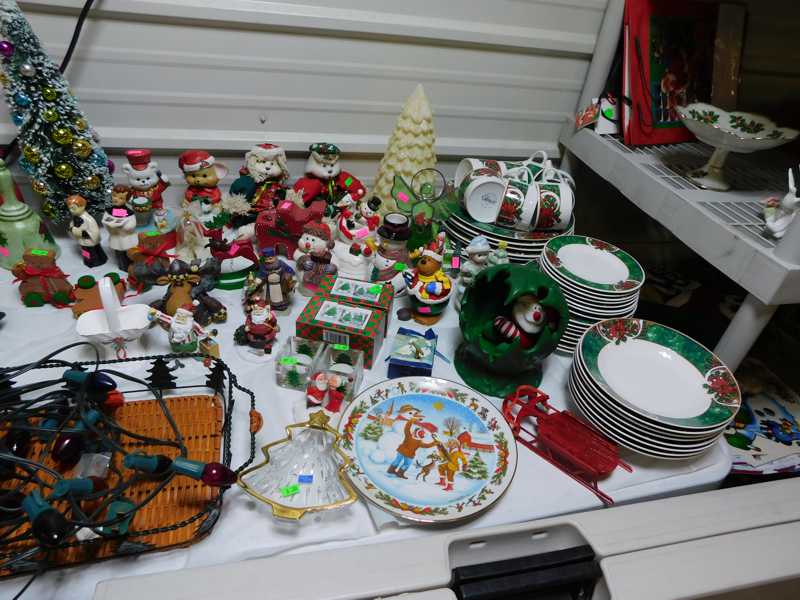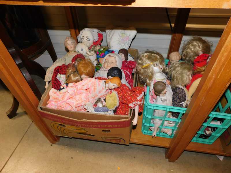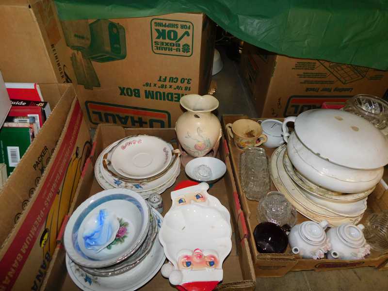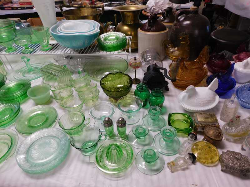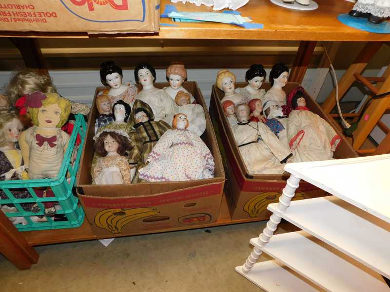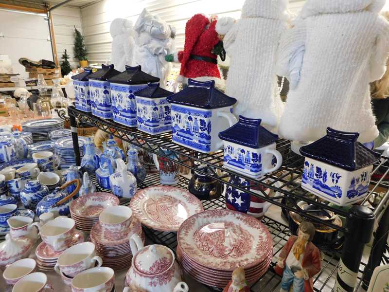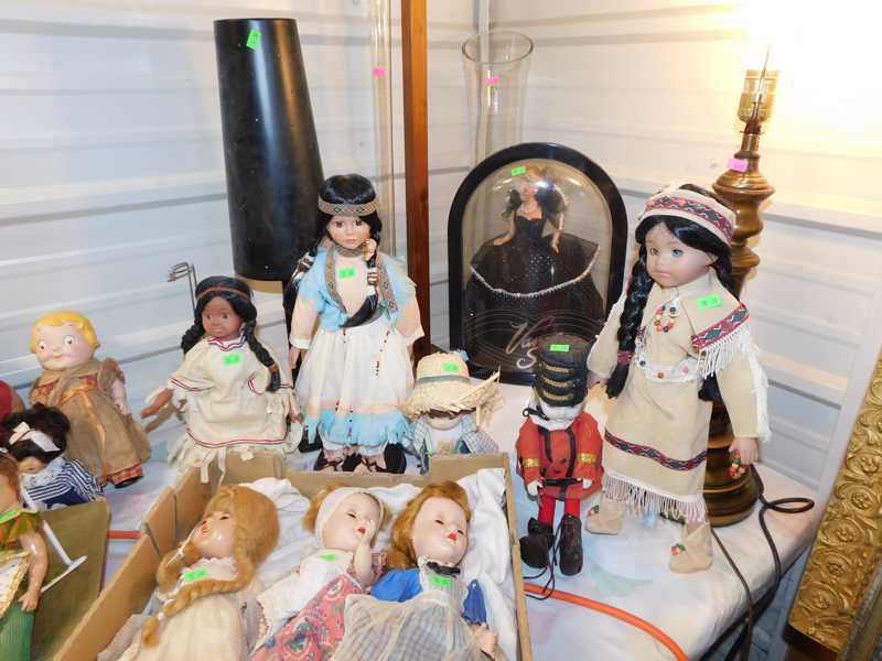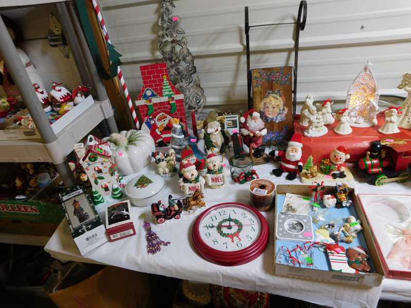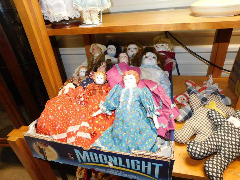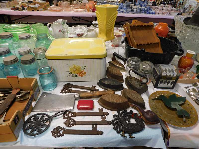 Depression glass, art glass, blue willow, lots of glassware and porcelain that has been packed since 1967. Primitives, advertising wood crates, Pyrex, Corning ware, McCoy, lots of cast iron Wagner, Griswold, #15 skillet, hand pump, antique fruit press, cream cans, oil lamps, sad irons, stoneware jugs and crocks, enamelware, Tools, Craftsman miter saw. Nice jewelry that we are just unpacking, decorator items, old skis, toboggan, dog kennels, old glass water bottles, books, art including some large antique oil paintings, Russell and signed Monte Dolack, Doll collection, Lots of Christmas decor.