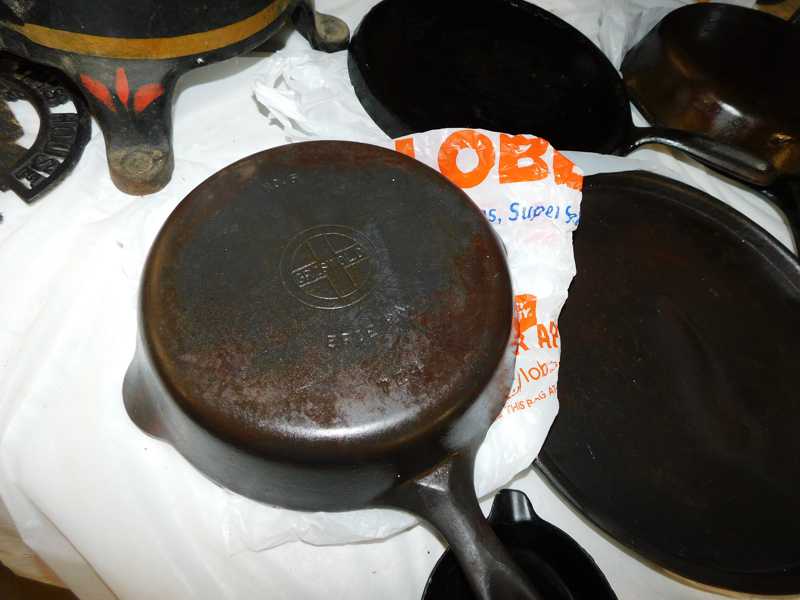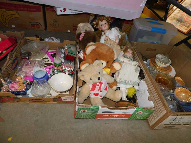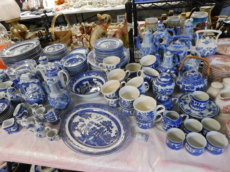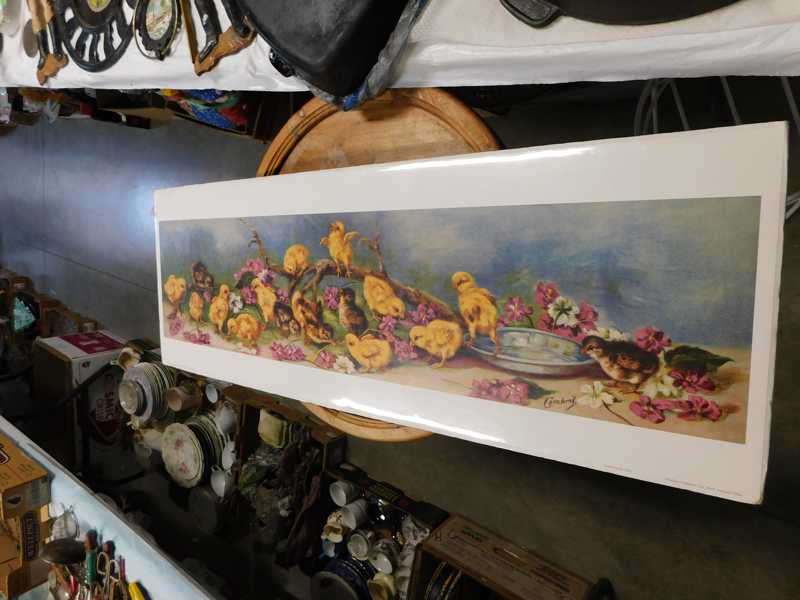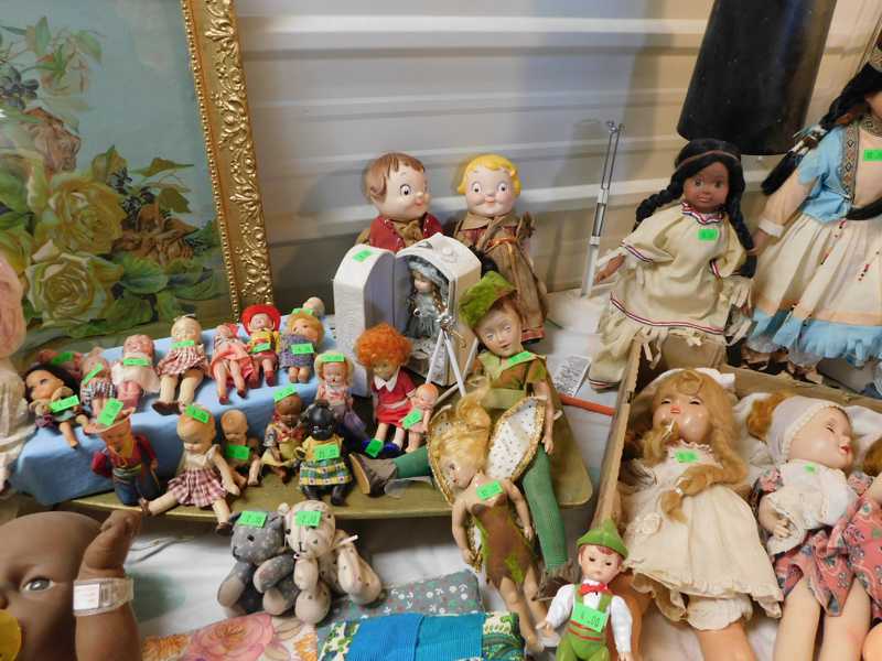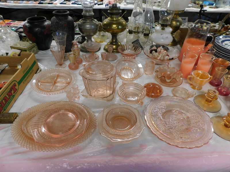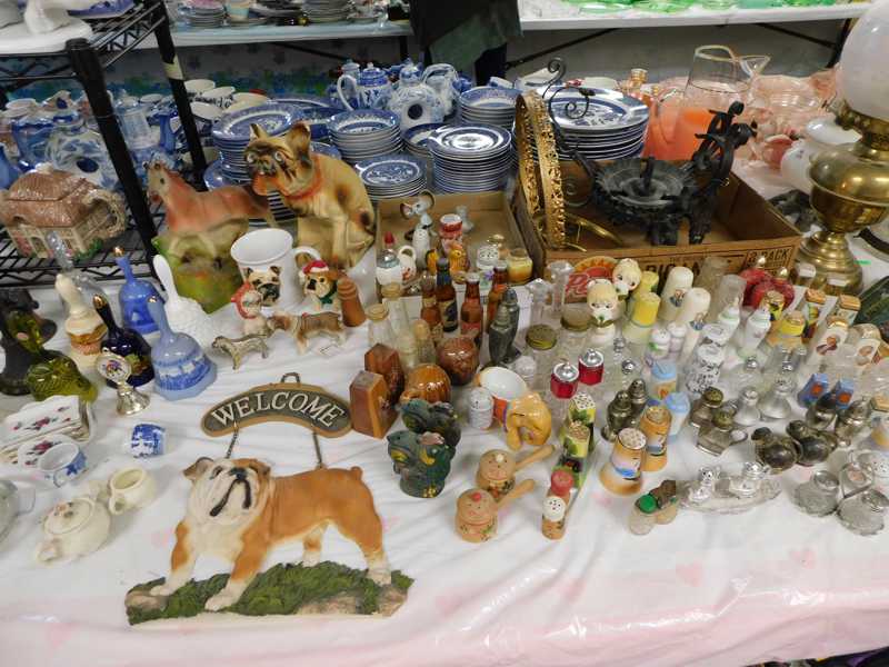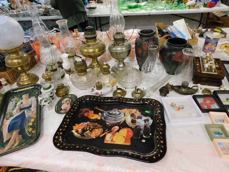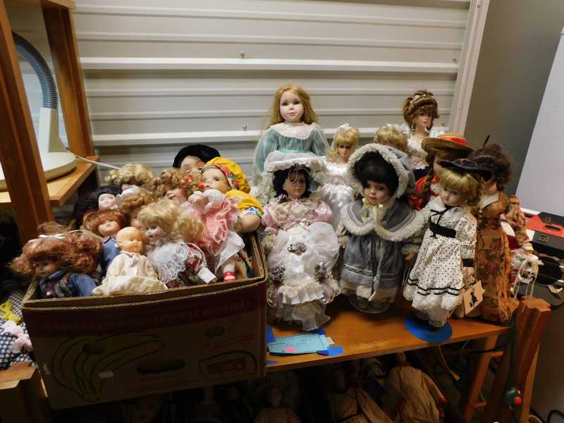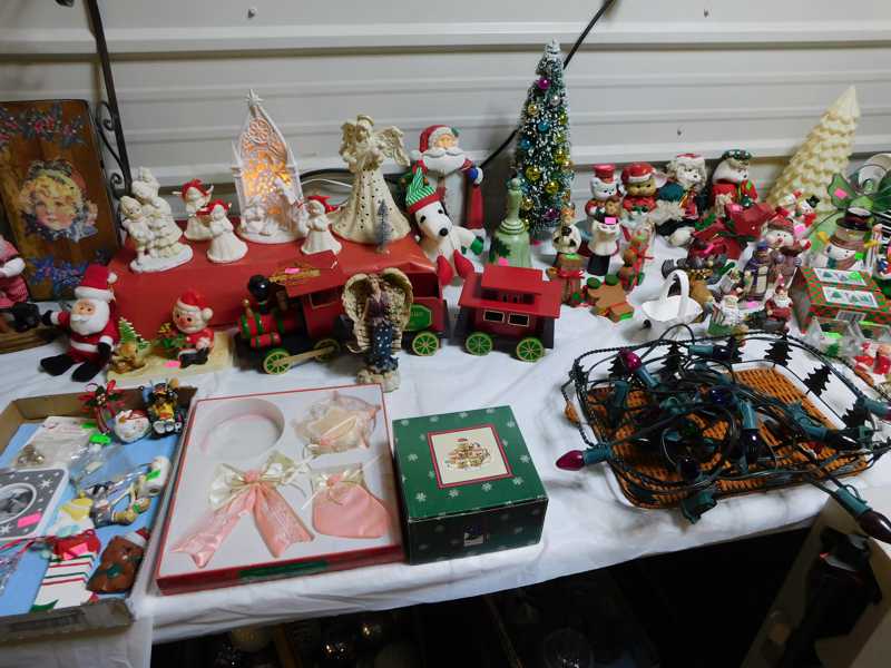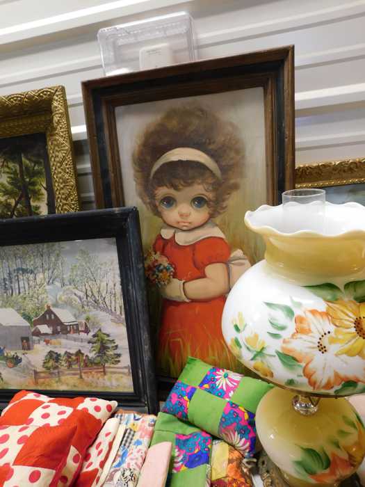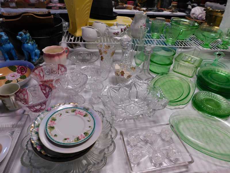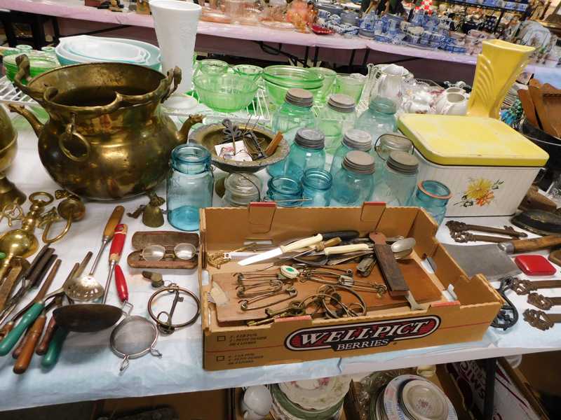 Depression glass, art glass, blue willow, lots of glassware and porcelain that has been packed since 1967. Primitives, advertising wood crates, Pyrex, Corning ware, McCoy, lots of cast iron Wagner, Griswold, #15 skillet, hand pump, antique fruit press, cream cans, oil lamps, sad irons, stoneware jugs and crocks, enamelware, Tools, Craftsman miter saw. Nice jewelry that we are just unpacking, decorator items, old skis, toboggan, dog kennels, old glass water bottles, books, art including some large antique oil paintings, Russell and signed Monte Dolack, Doll collection, Lots of Christmas decor.