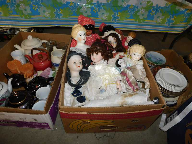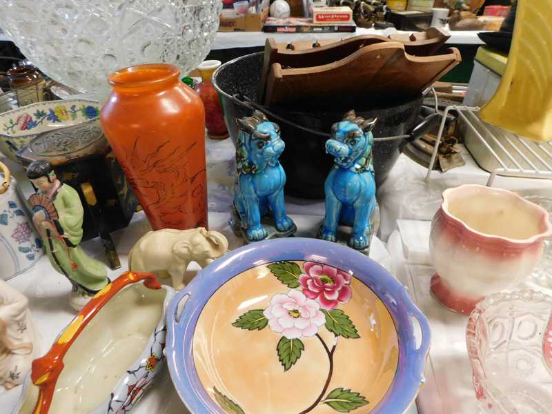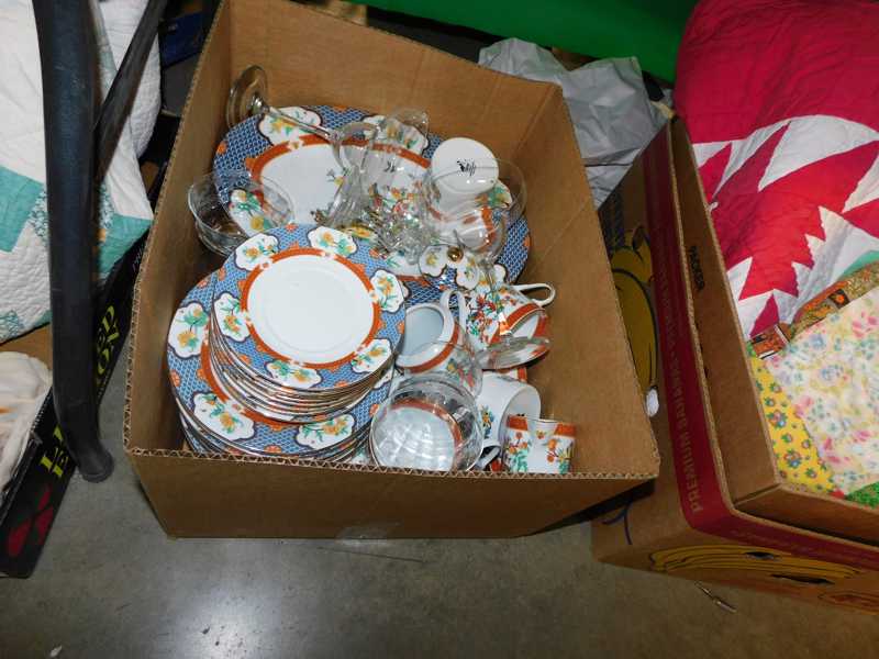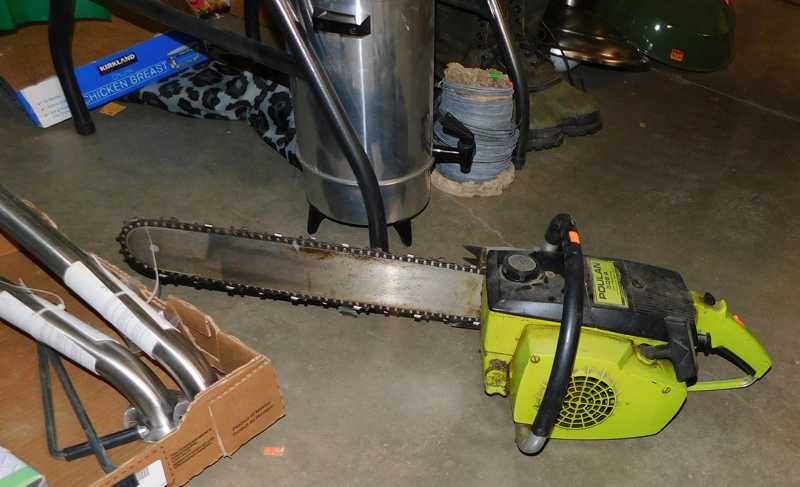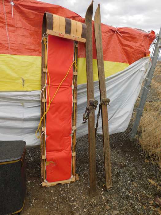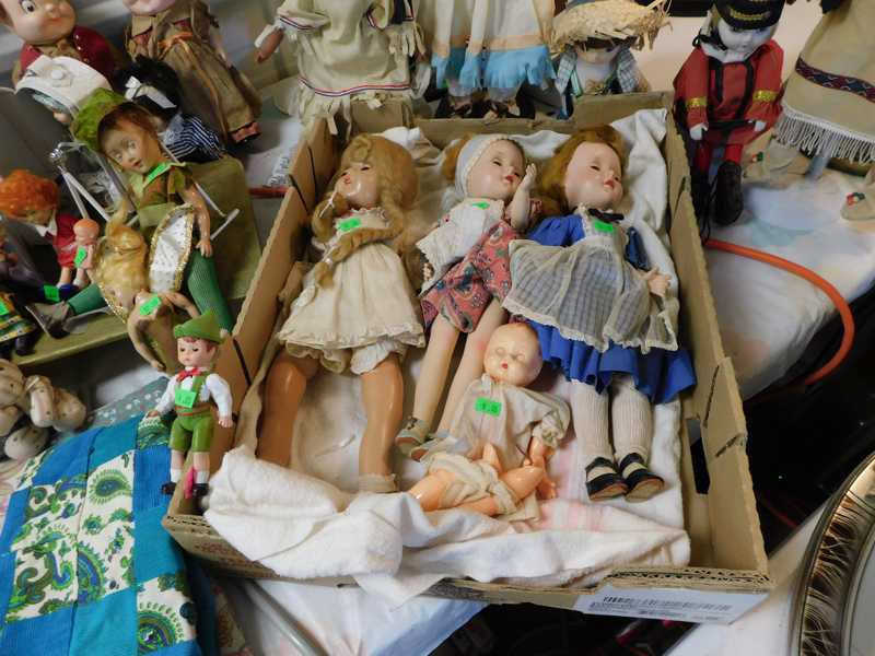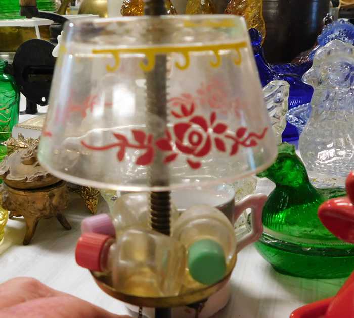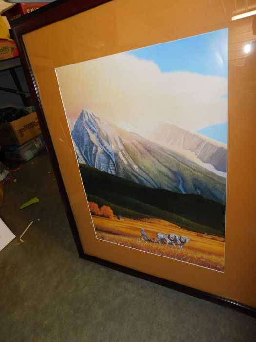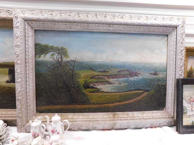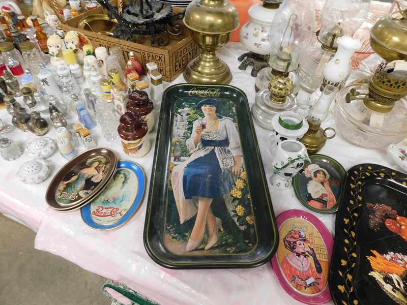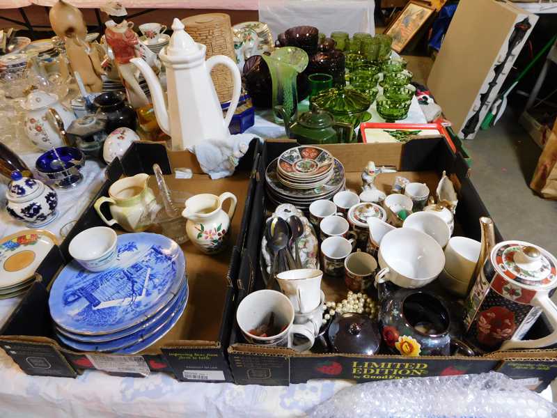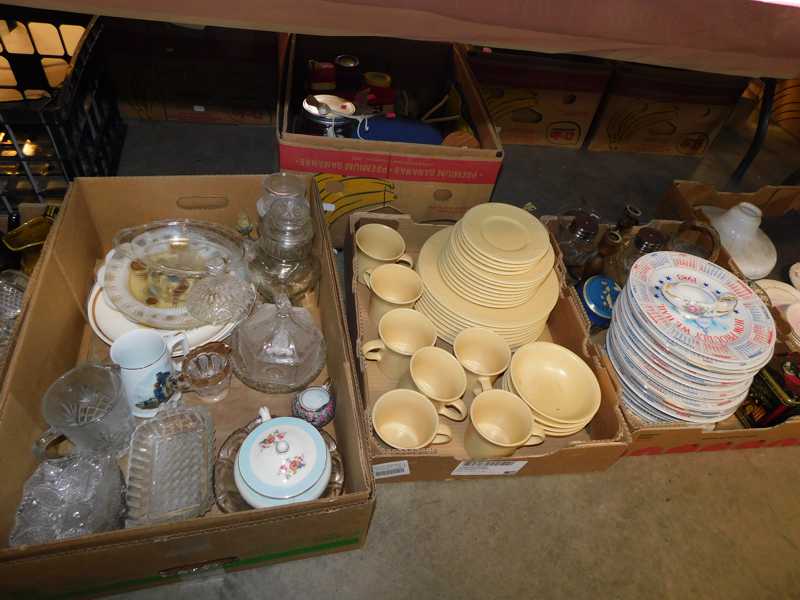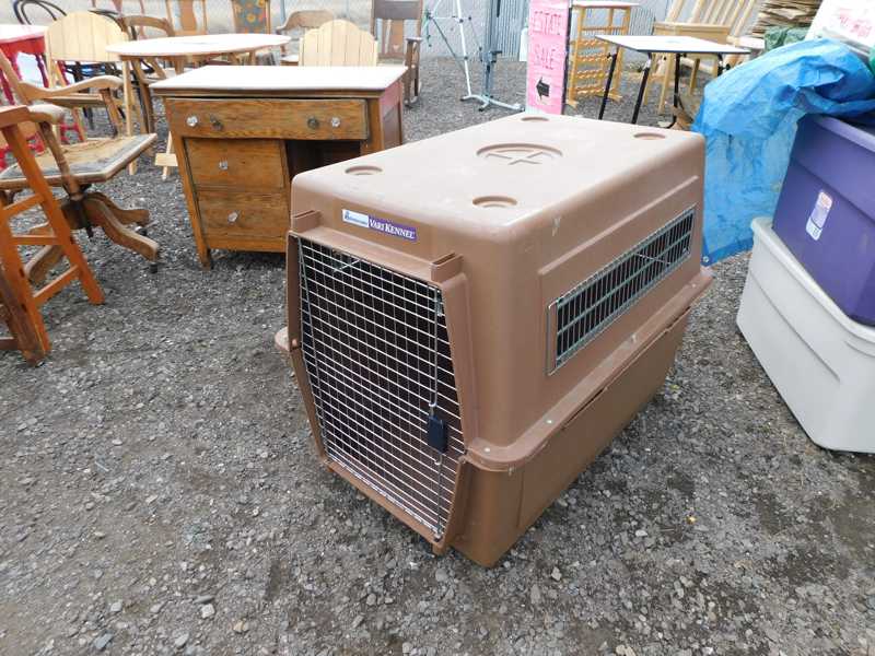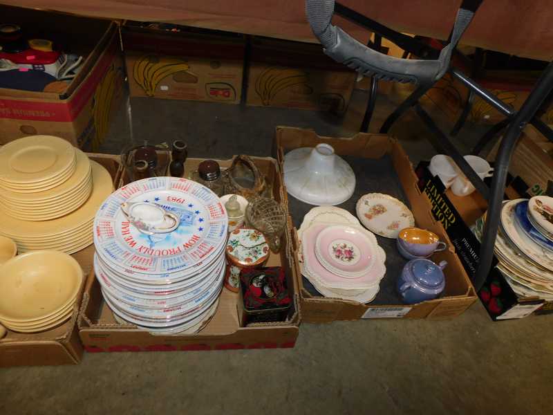 Depression glass, art glass, blue willow, lots of glassware and porcelain that has been packed since 1967. Primitives, advertising wood crates, Pyrex, Corning ware, McCoy, lots of cast iron Wagner, Griswold, #15 skillet, hand pump, antique fruit press, cream cans, oil lamps, sad irons, stoneware jugs and crocks, enamelware, Tools, Craftsman miter saw. Nice jewelry that we are just unpacking, decorator items, old skis, toboggan, dog kennels, old glass water bottles, books, art including some large antique oil paintings, Russell and signed Monte Dolack, Doll collection, Lots of Christmas decor.