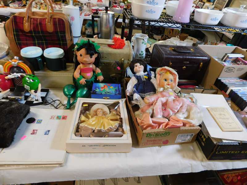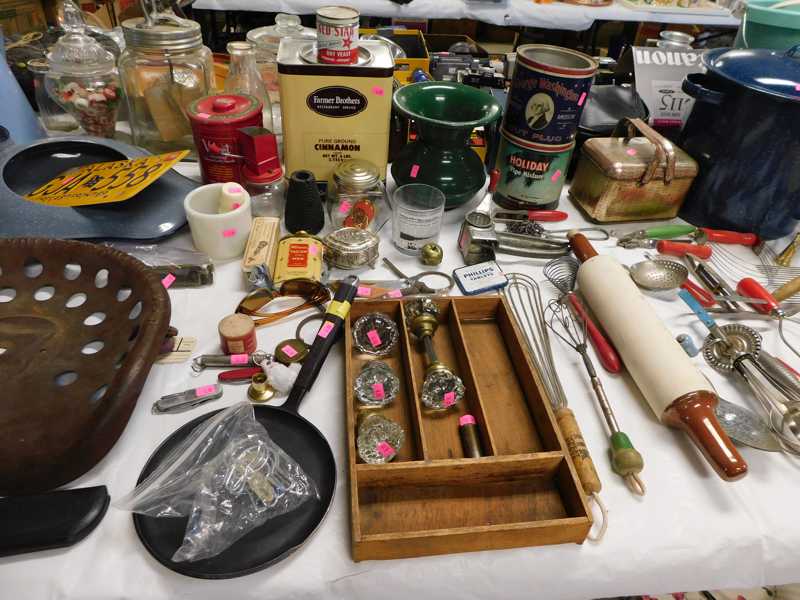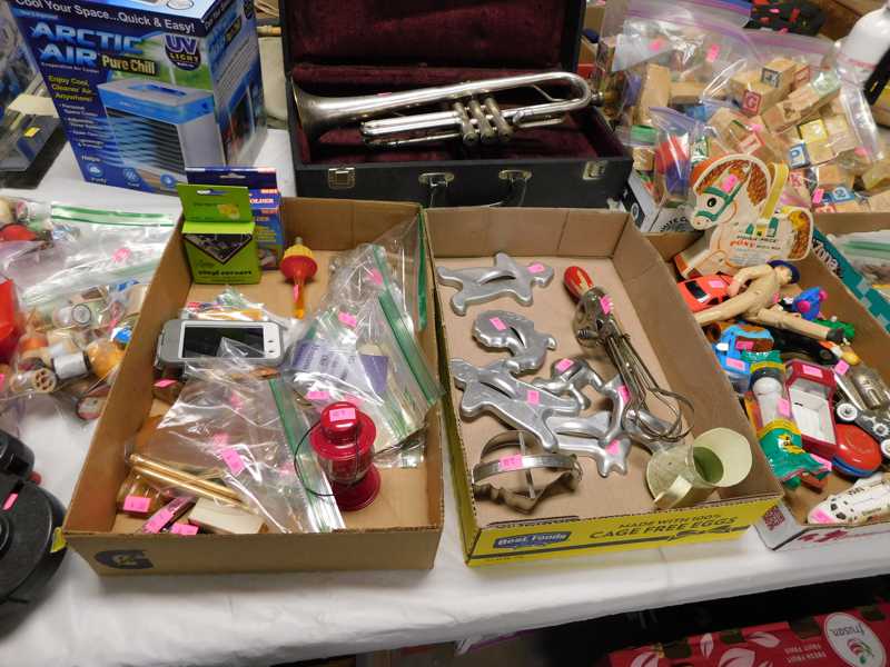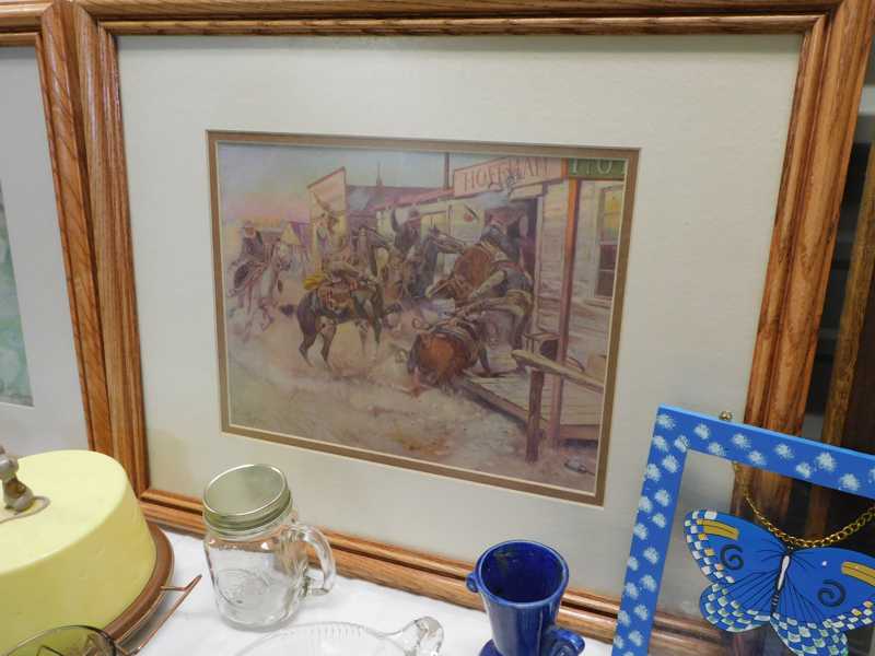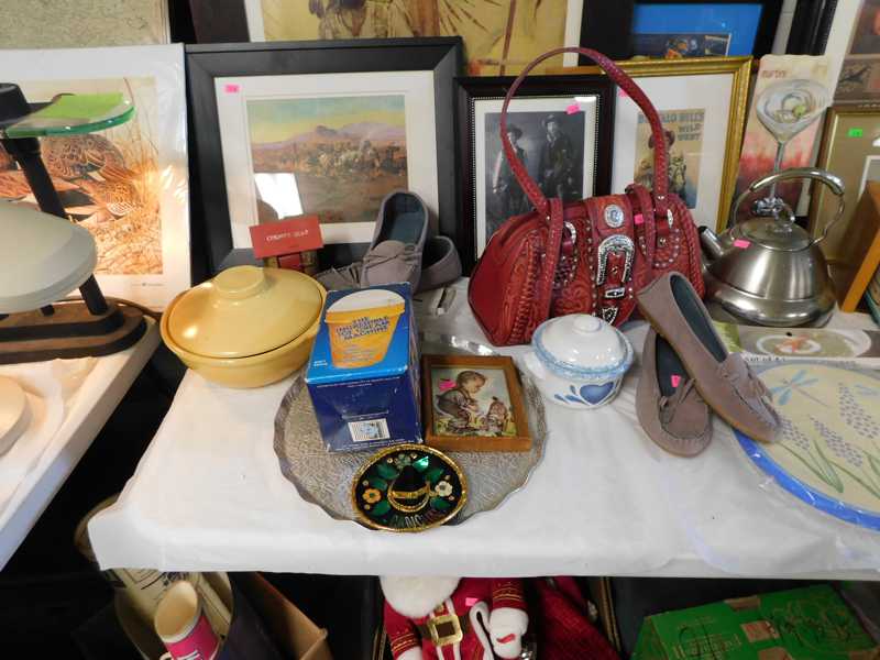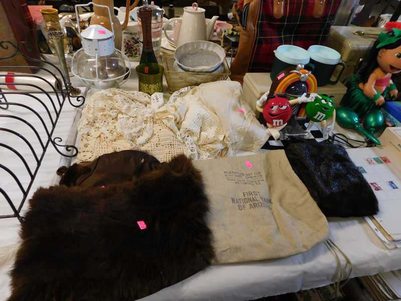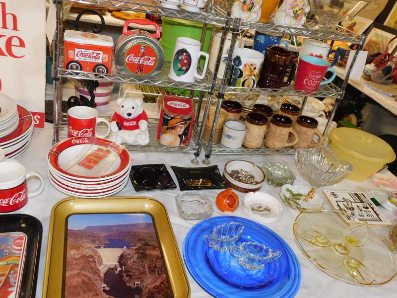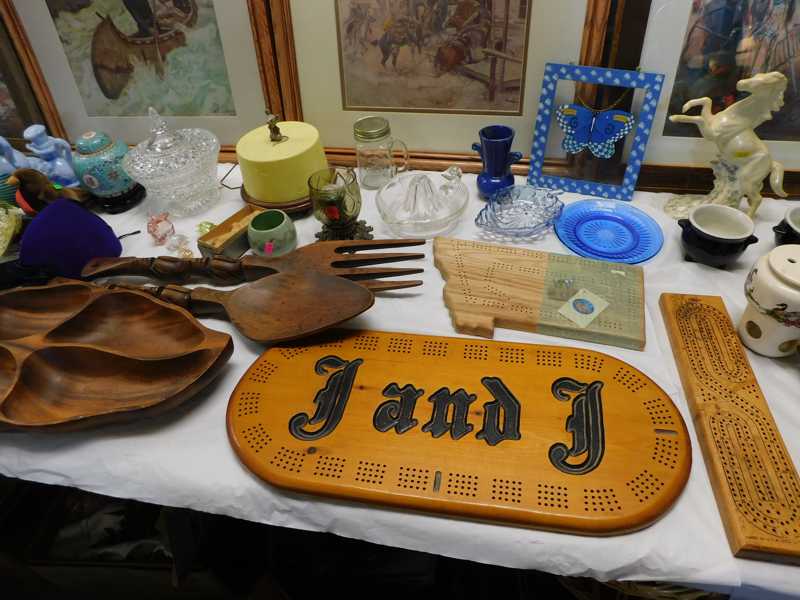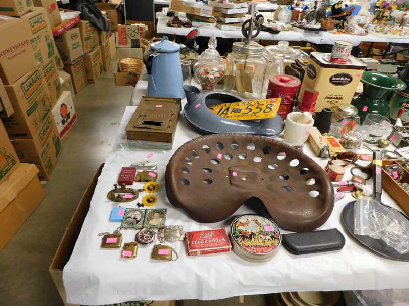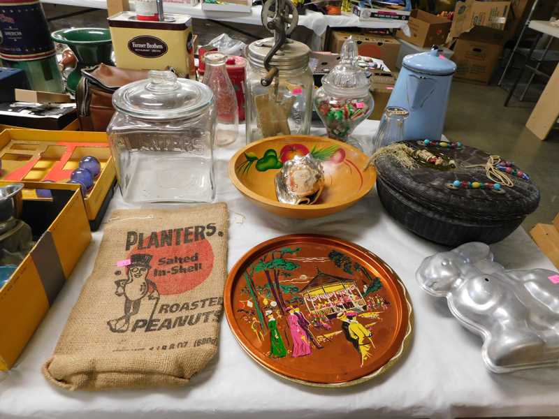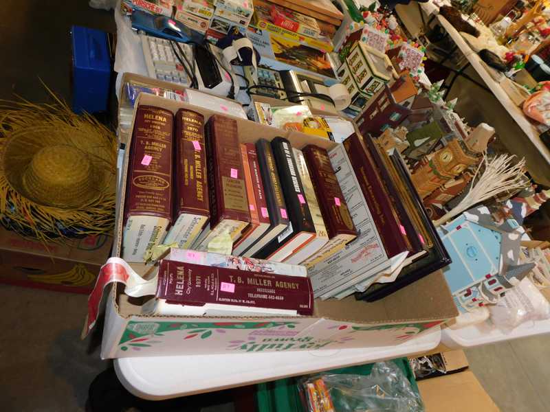 MCM table and chairs, collectibles, antiques, primitives, advertising tins, butter churn, Planters Peanut jar, Coca Cola collectibles, glassware, mid-century items. Housewares and cookware. Art includes Becky Eiker bronze, art prints, Montana letterheads and paper dating to the 1880’s. Clothing some vintage including a great vintage Helena High School twirler’s outfit, shoes, flag and blanket, vintage NY Yankees jacket. Baskets, estate jewelry, watches, books, DVD’s, fun signs, linens, toys, dolls, stuffed animals, old coins and tokens, tools, old woodworking planes, cameras, vacuums, linens, trumpet, and so much more.
